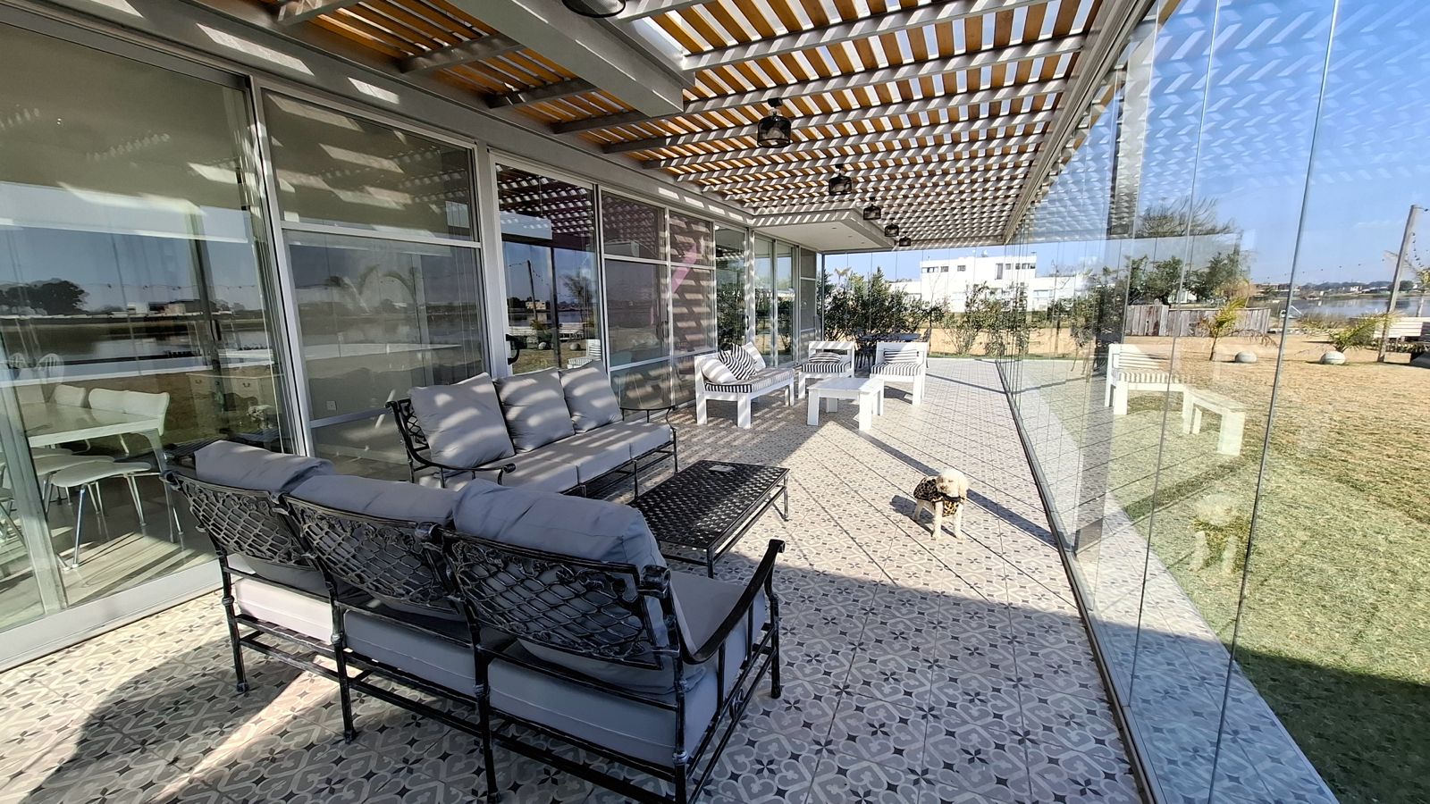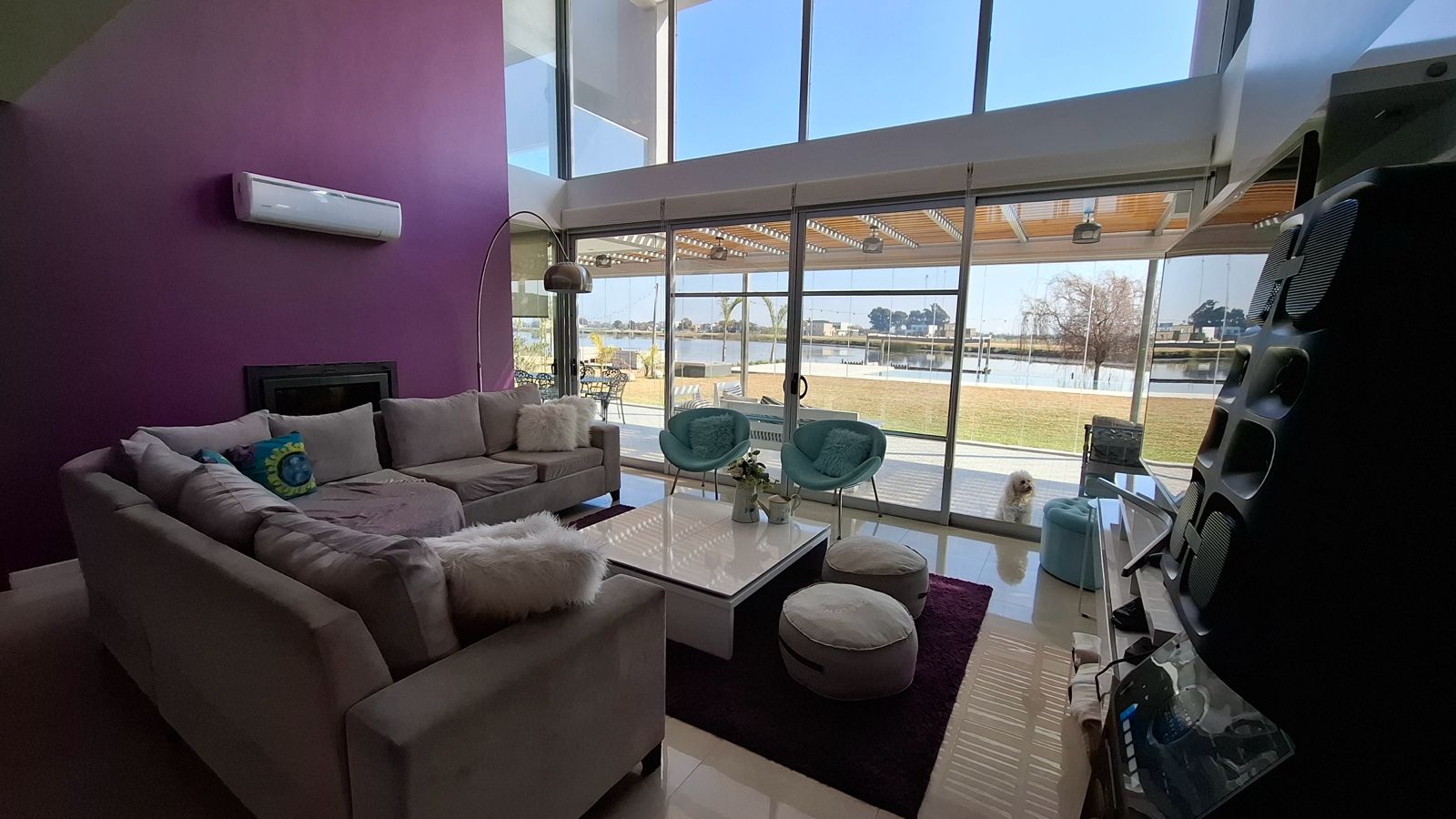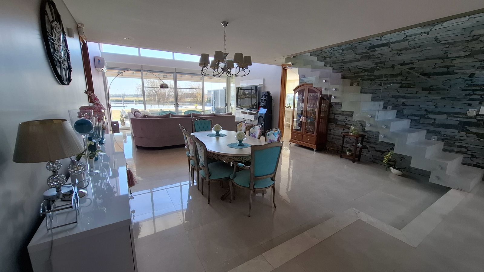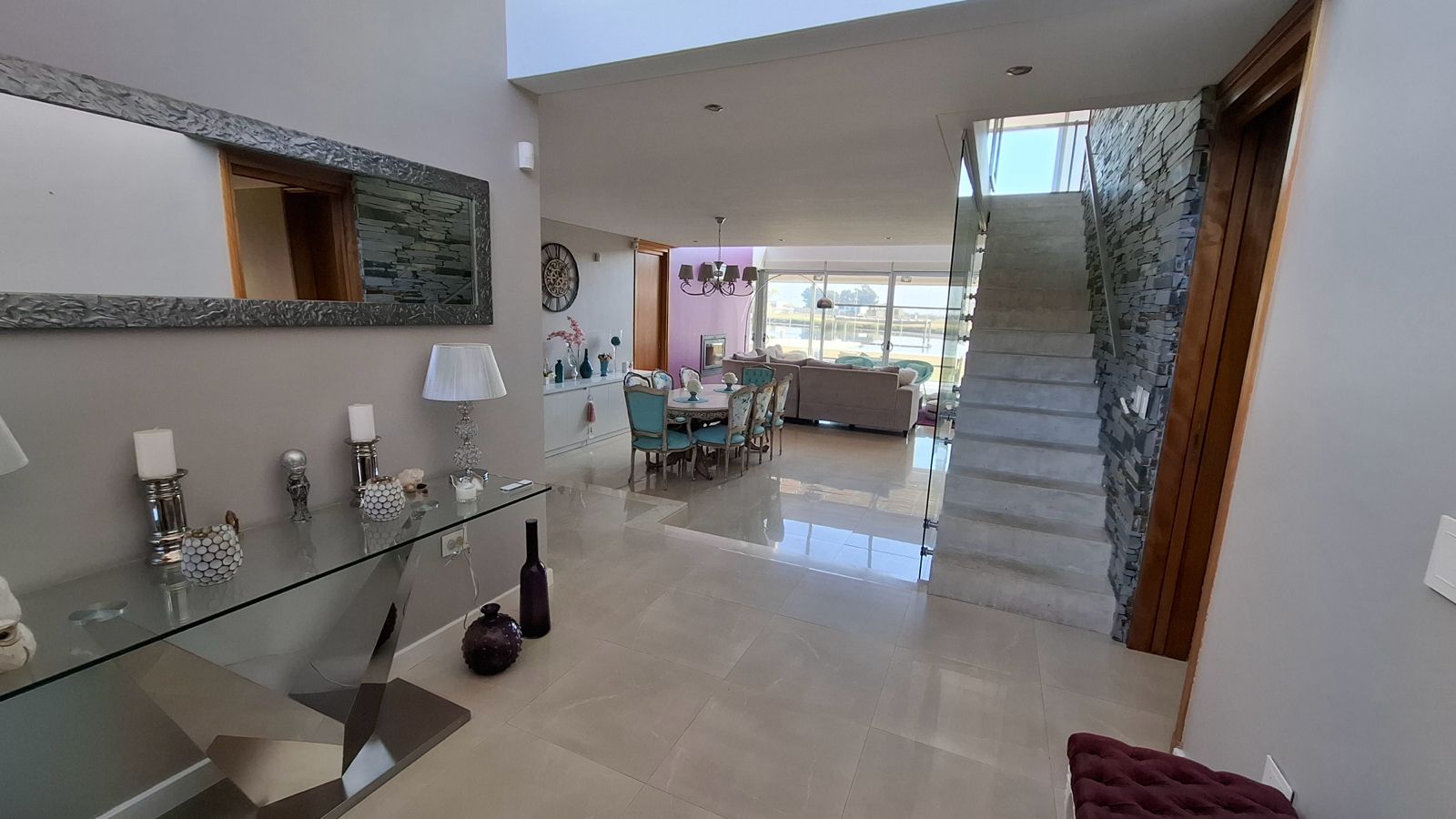 La propiedad fue diseñada en dos plantas, con un hall de entrada de doble altura. Todo el diseño está orientado a maximizar la vista hacia la laguna desde cualquier punto de la planta baja, gracias a un excelente trabajo de ventanales que integran interior y exterior.
